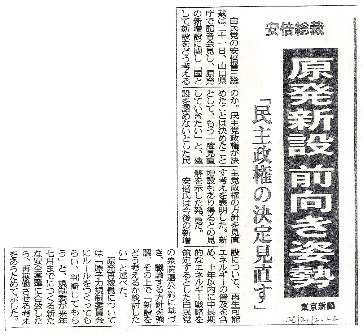 [2012_12_22_01]安倍総裁 原発新設 前向き姿勢 「民主政権の決定見直す」(東京新聞2012年12月22日)