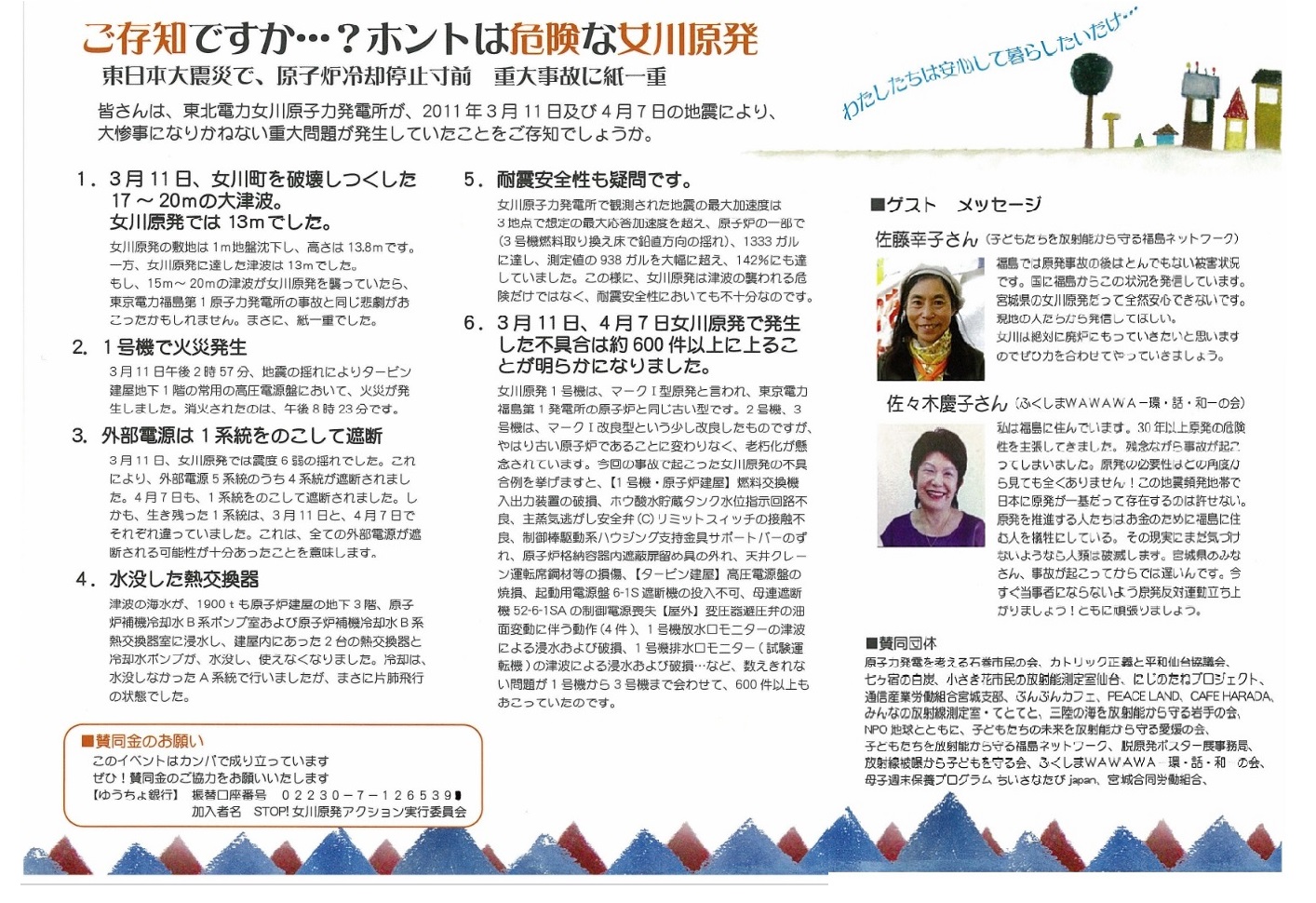 | [2012_03_20_02]ご存知ですか・・・?ホントは危険な女川原発 東日本大震災で、原子炉冷却停止寸前 重大事故に紙一重(STOP!女川原発_3.20アクション実行委員会2012年3月20日) |