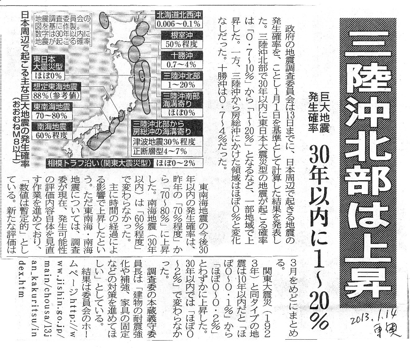 | [2013_01_14_02]三陸沖北部は上昇 巨大地震発生確率 30年以内に1〜20%(東奥日報2013年1月14日) |