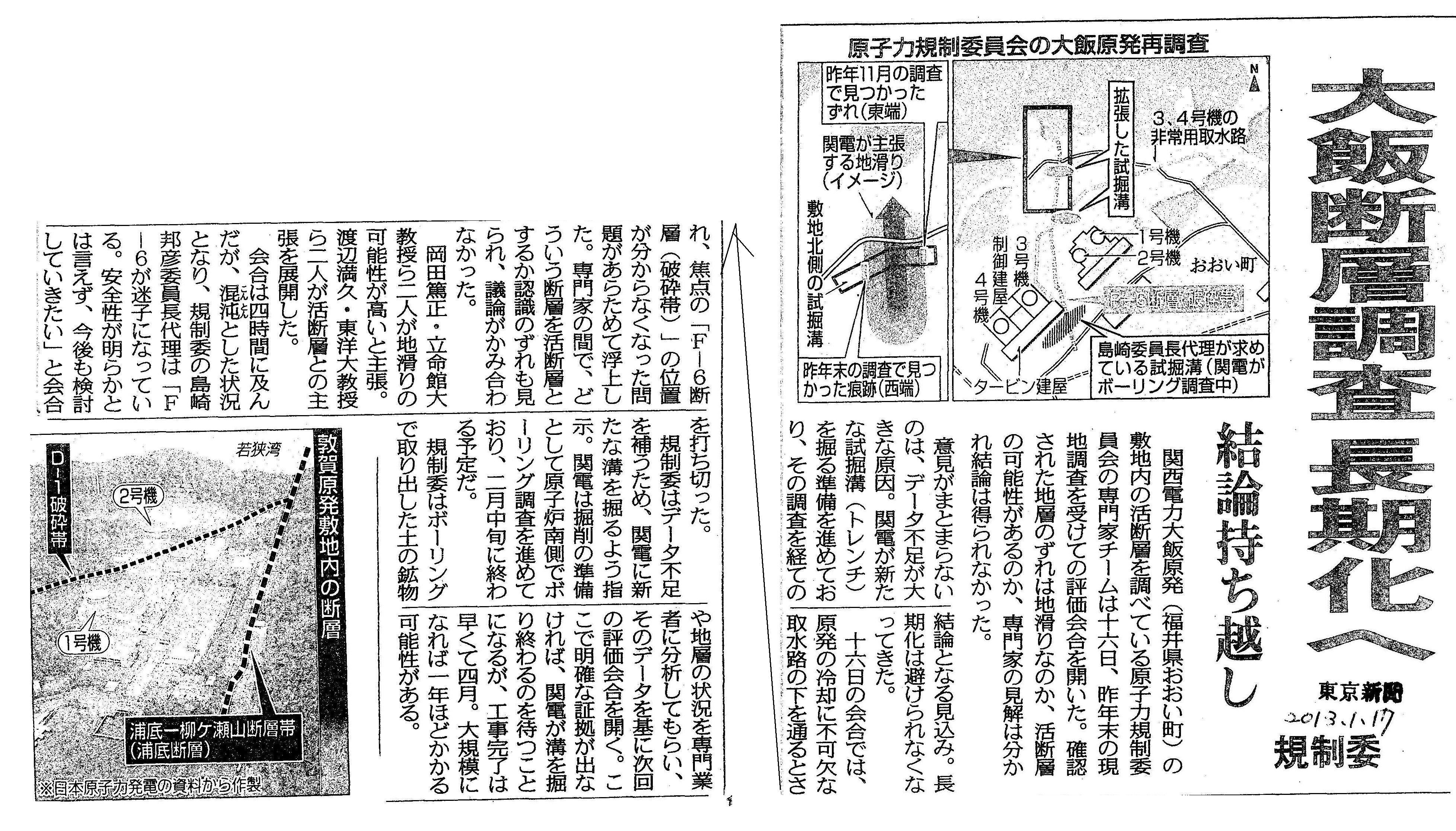 [2013_01_17_01]規制委 大飯断層調査 長期化へ 結論持ち越し(東京新聞2013年1月17日)