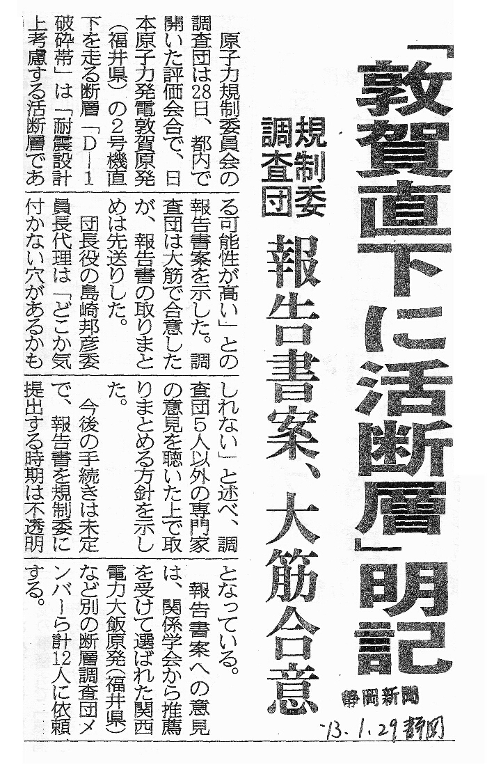 | [2013_01_29_02]「敦賀直下に活断層」明記 規制委調査団 報告書案、大筋合意(静岡新聞2013年1月29日) |