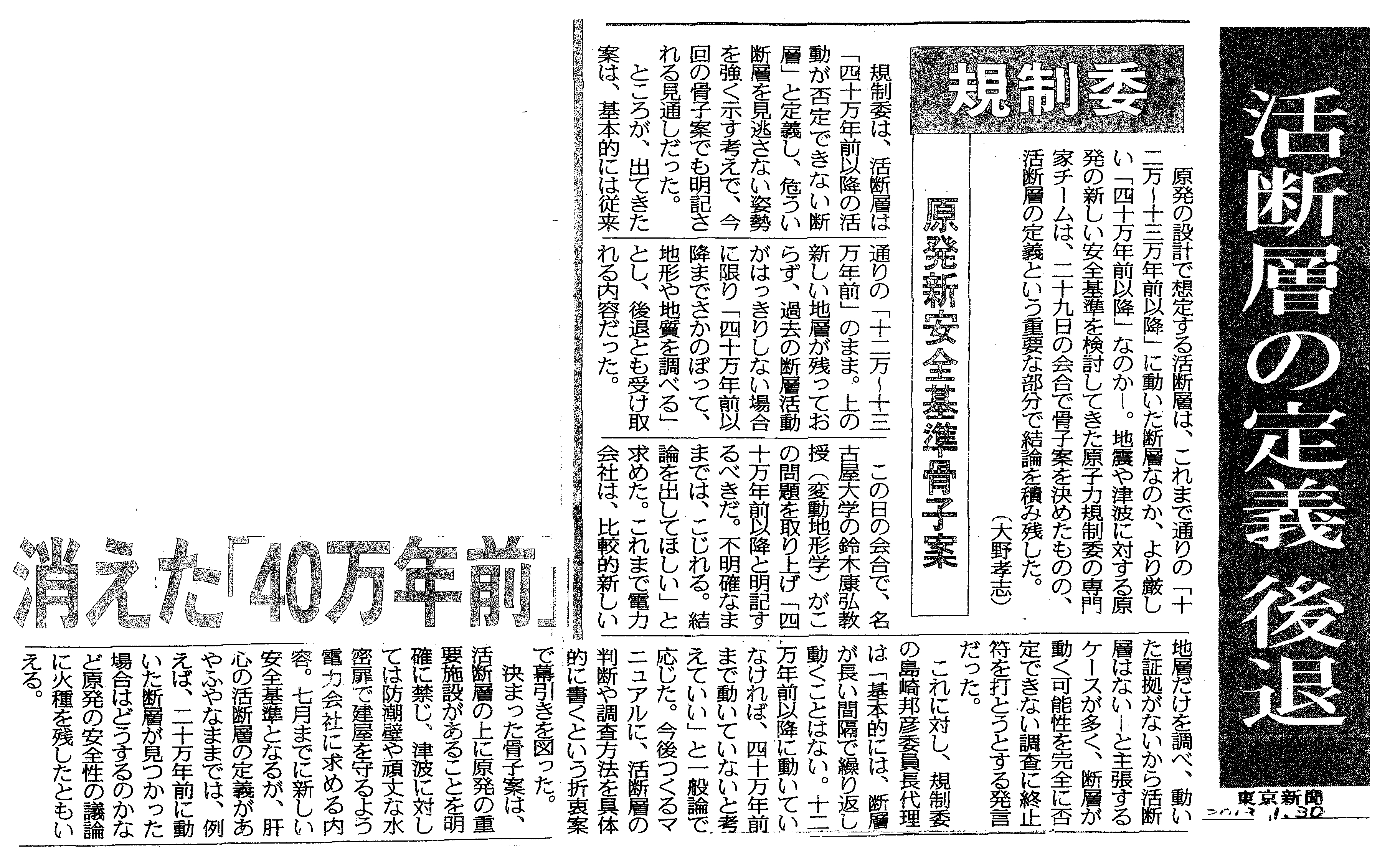 [2013_01_30_01]規制委 活断層の定義後退 消えた「40万年前」(東京新聞2013年1月30日)