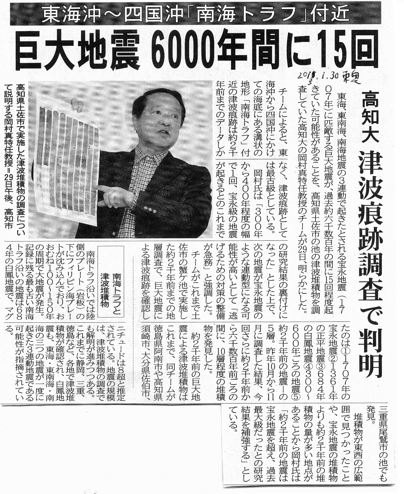 | [2013_01_30_03]東海沖〜四国沖「南海トラフ」付近 大地震6000年間に15回 高知大 津波痕跡調査で説明(東奥日報2013年1月30日) |