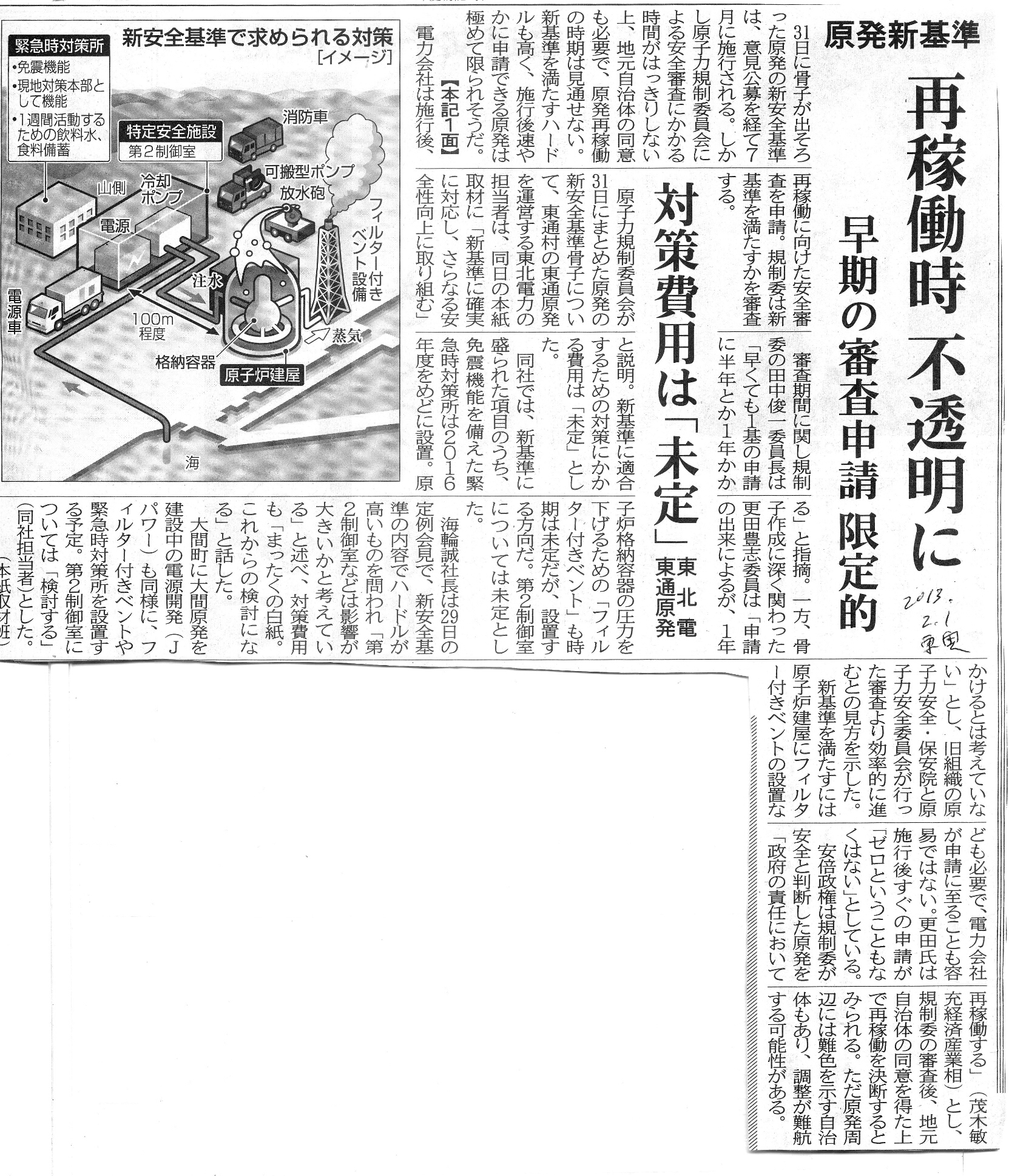 | [2013_02_01_01]原発新基準 再稼働時 不透明に 早期の審査申請 限定的 対策費用は「未定」 東北電 東通原発(東奥日報2013年2月1日) |