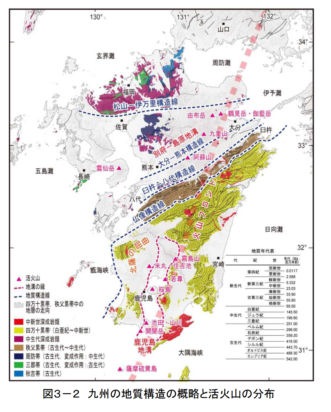 参照元 ![]() ※引用者注:以下は3ページ目の抜粋 新第三紀以前(約2,500万年以前)に形成された地質構造は、現在のテクトニクス(地殻変動や地震活動)とも密接に関連 基本的には西南日本弧と類似した帯状構造を示しており、臼杵−八代構造線を境に、内帯と外帯に分けられる。 臼杵−八代構造線とその北方に平行する大分−熊本構造線は、中央構造線から連続しており、重力異常の急変帯となっている。 大分−熊本構造線の北側は沈降帯で、約600万年前から火山活動に伴って形成され、新しい火山が分布する。地震活動も活発で、日本の陸上としては特異な伸張性の変形が卓越した領域。沈降帯は松山−伊万里構造線を北限としている。 構造線の一部は、活断層としても活動。 |