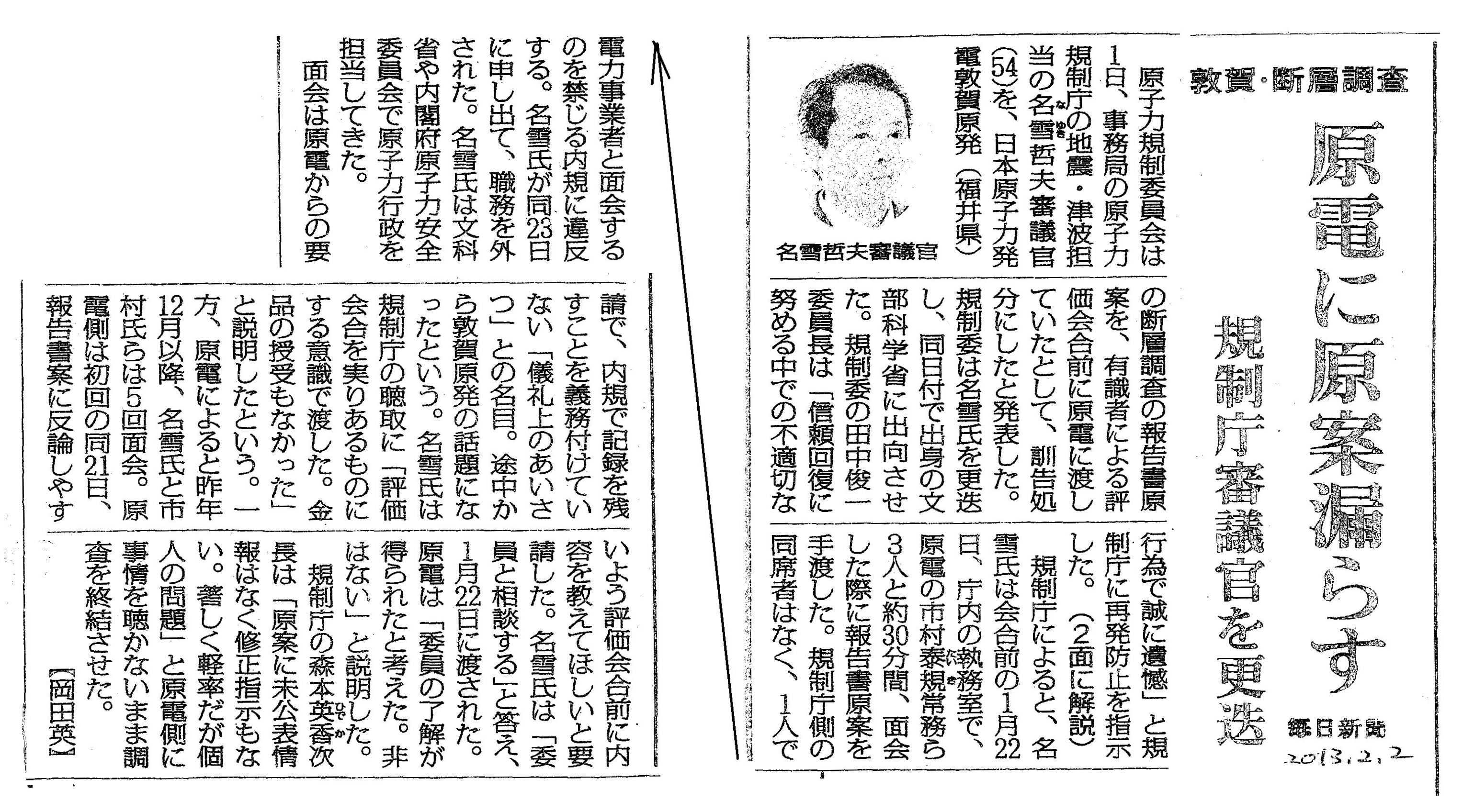 | [2013_02_02_01]敦賀・断層調査 原電に原案漏らした名雪審議官を更迭(毎日新聞2013年2月2日) |
