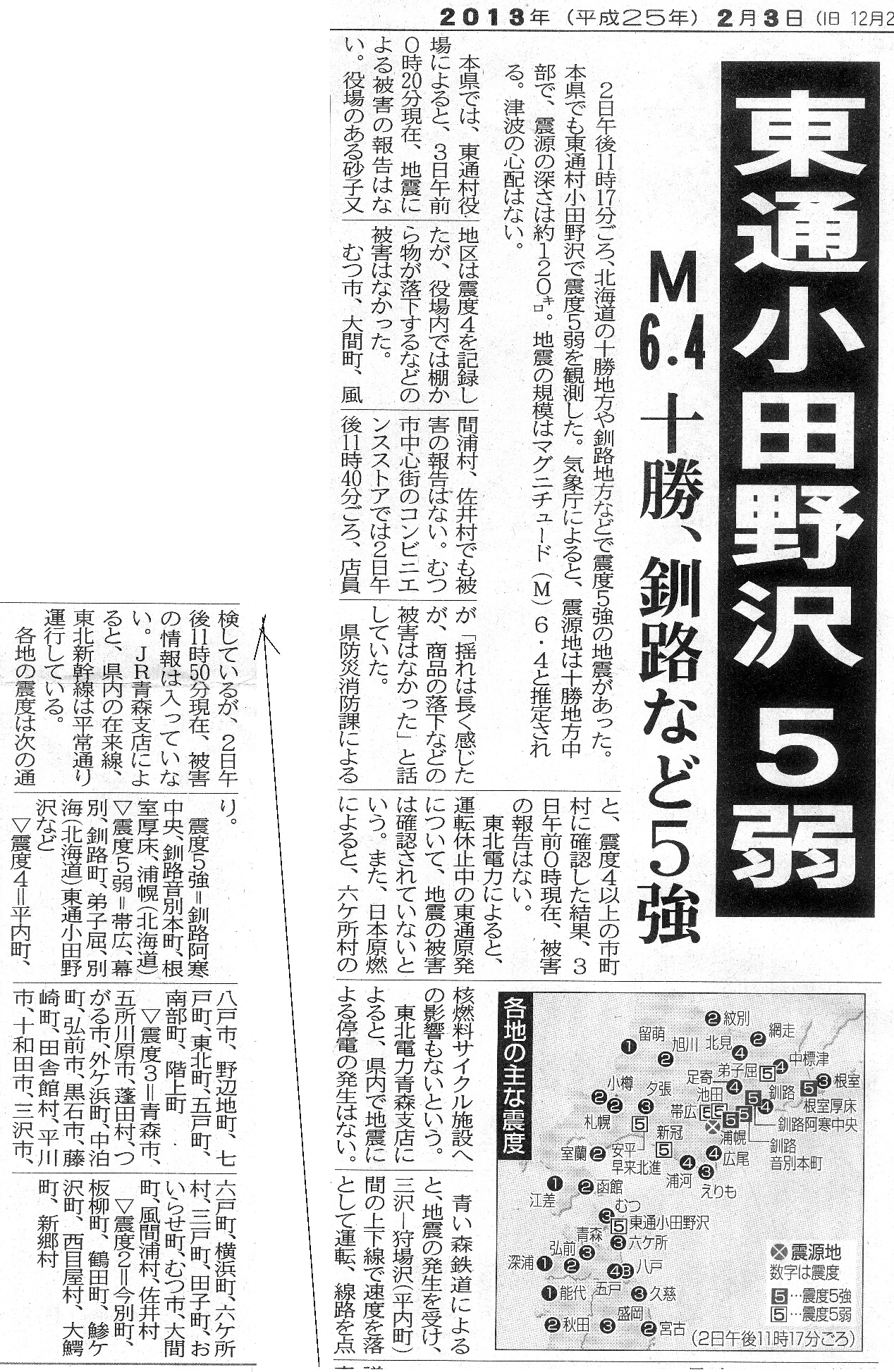 | [2013_02_03_01]東通小田野沢 5弱 M6.4 十勝、釧路など5強(東奥日報2013年2月3日) |