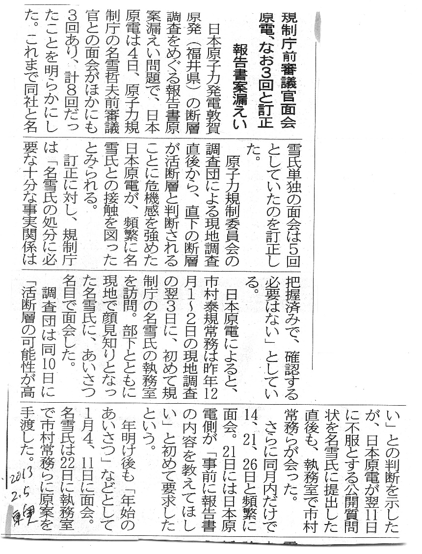 [2013_02_05_01]規制庁前審議官面会 原電、なお3回と訂正 報告書漏えい(東奥日報2013年2月5日)