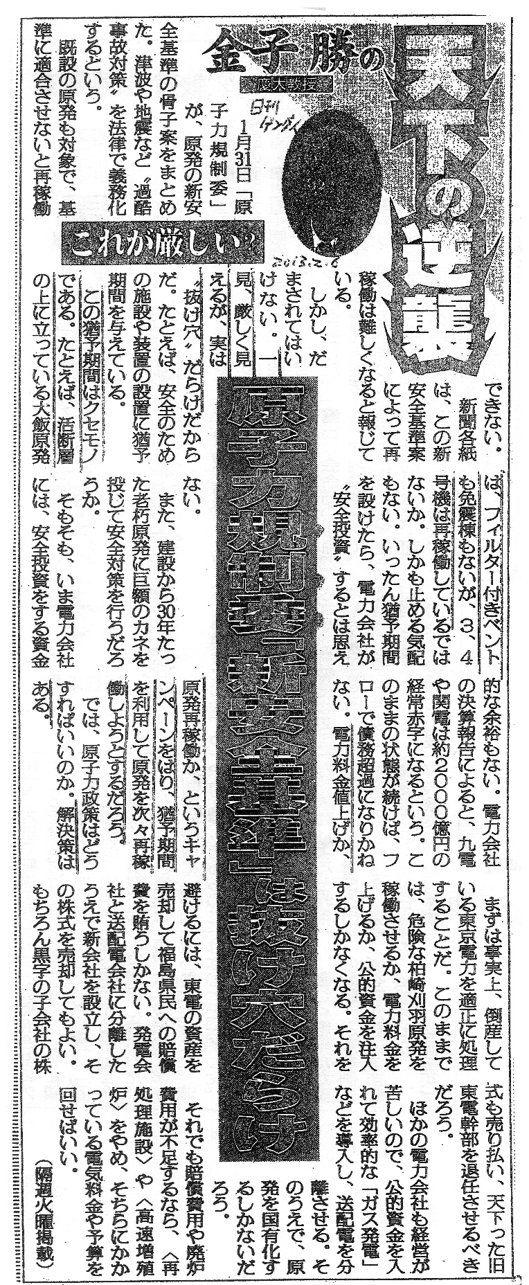 [2013_02_06_01]金子勝の天下の逆襲 これが厳しい? 原子力規制委「新安全基準」は抜け穴だらけ(日刊ゲンダイ2013年2月6日)