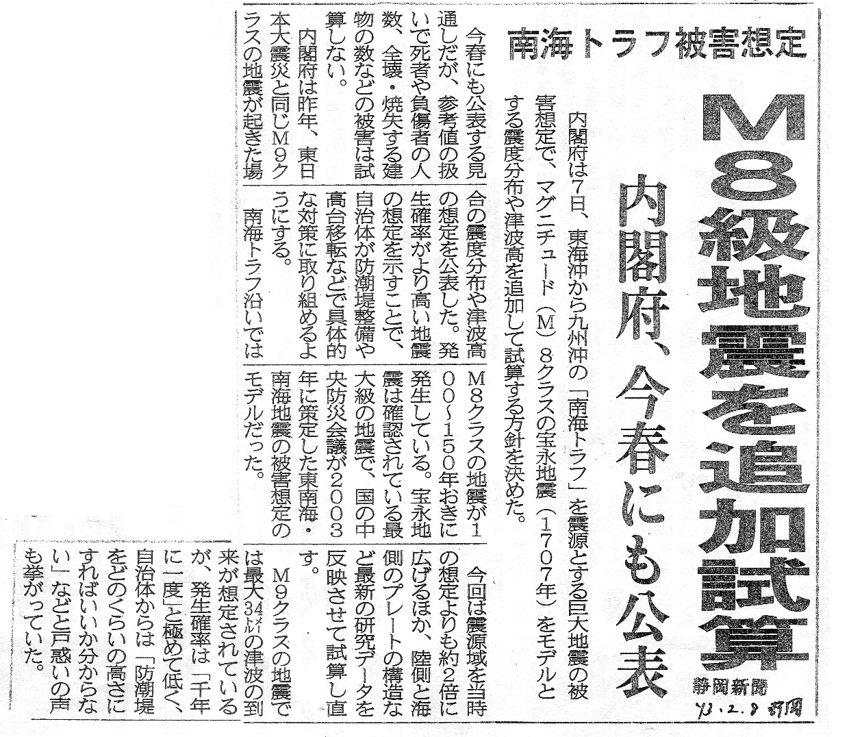 [2013_02_08_04]南海トラフ被害想定 M8級地震を追加試算 内閣府、今春にも公表(静岡新聞2013年2月8日)