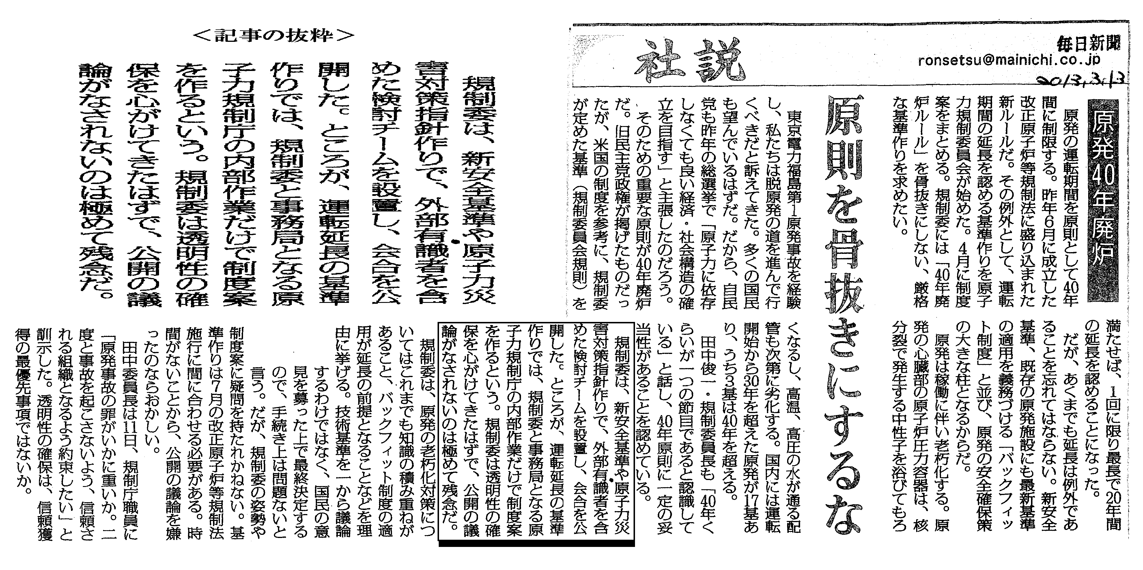 [2013_03_13_01]社説 原発40年で廃炉 原則を骨抜きにするな(毎日新聞2013年3月13日)