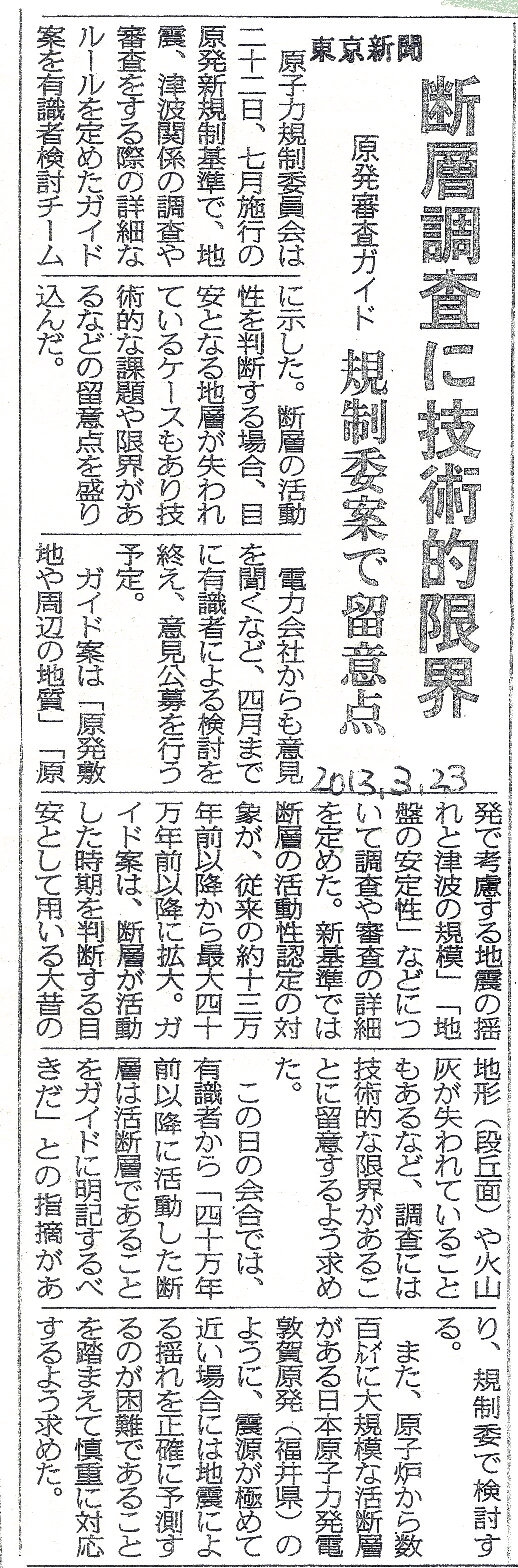 | [2013_03_23_01]断層調査に技術的限外 原発審査ガイド 規制委案で留意点(東奥日報2013年3月23日) |