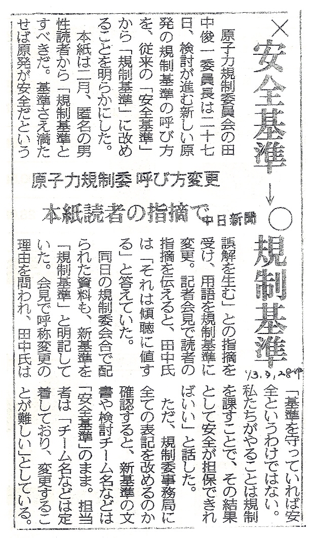 [2013_03_28_02]×安全基準 −> ○規制基準 原子力規制委 呼び方変更 本誌読者の指摘で(東奥日報2013年3月28日)