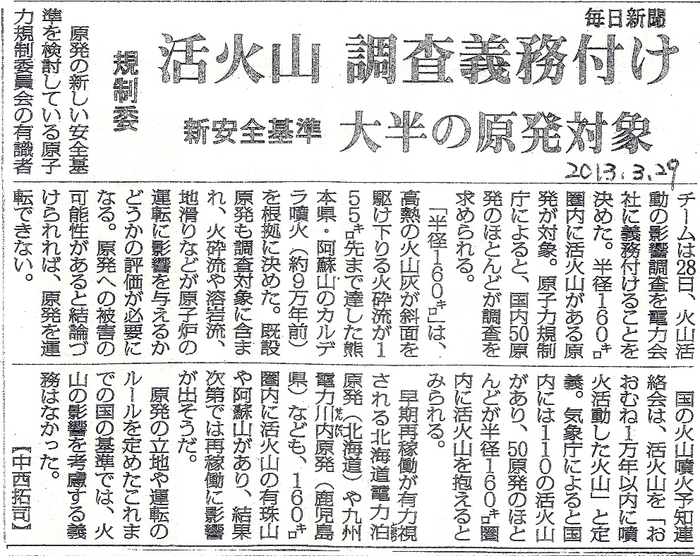 [2013_03_29_01]活火山 調査義務付け 新安全基準 大半の原発対象 規制委(東奥日報2013年3月29日)