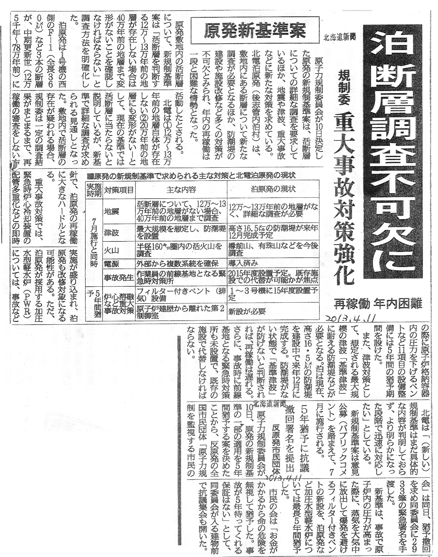 | [2013_04_11_01]泊断層調査不可欠に 規制委 重大事故対策強化 再稼働年内困難 原発新基準案(北海道新聞2013年4月11日) |