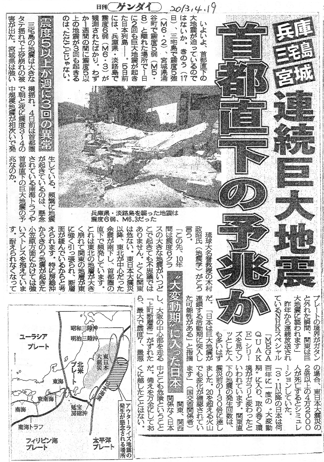 [2013_04_19_01]兵庫 三宅島 宮城 連続巨大地震 首都直下の予兆か 震度5以上が週に3回の異常 ”大変動期”に入った日本(日刊ゲンダイ2013年4月19日)