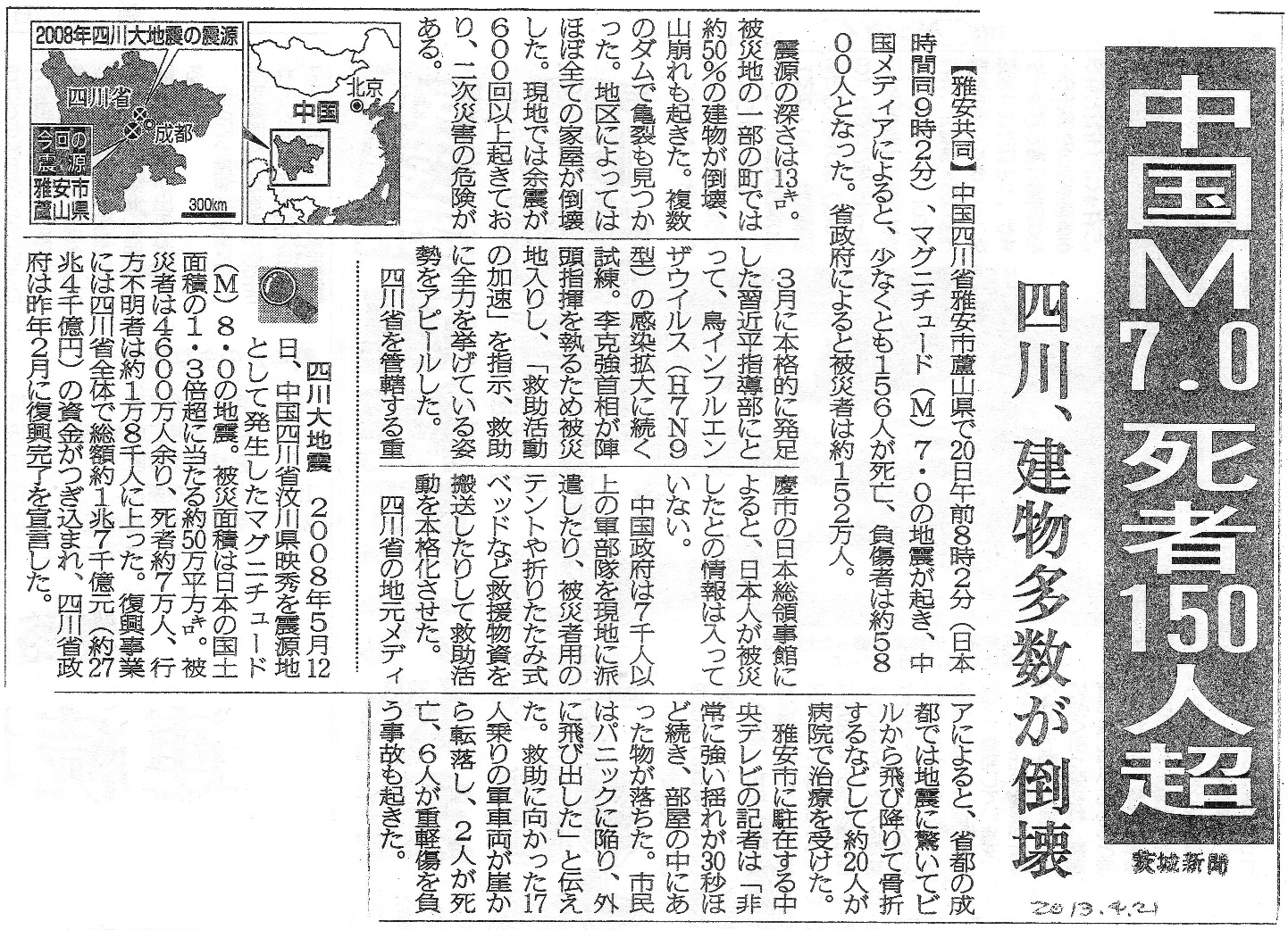 [2013_04_21_02]中国M7.0 死者150人超 四川、建物多数が崩壊(茨城新聞2013年4月21日)