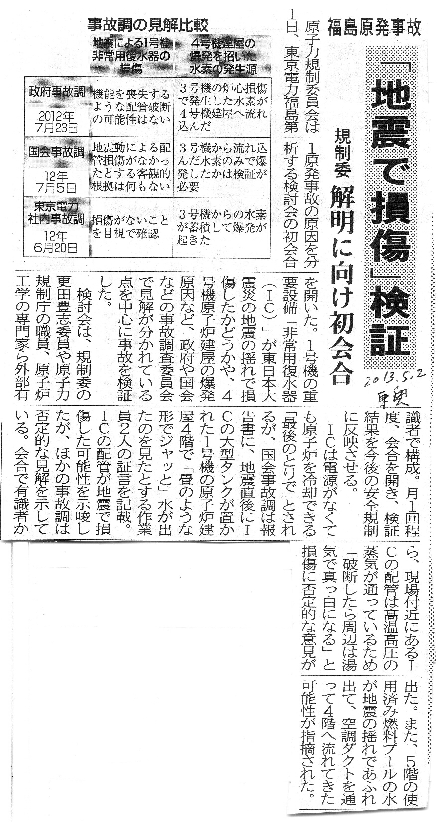 [2013_05_02_01]福島原発事故 「地震で損傷」 検証 規制委 解明に向け初会合(東奥日報2013年5月2日)