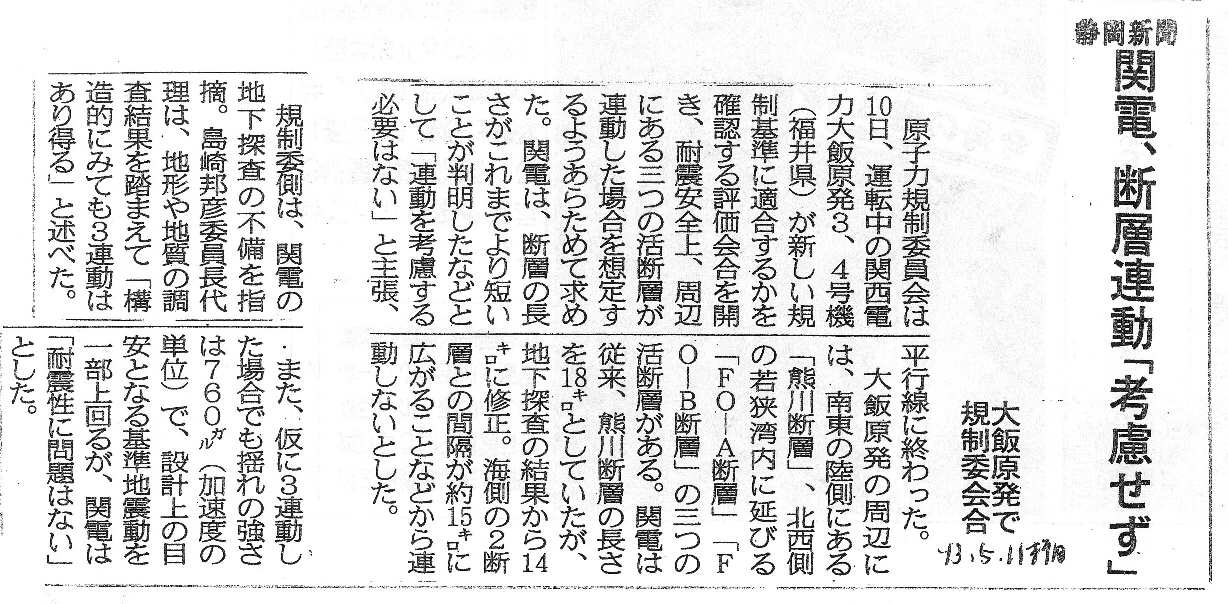 [2013_05_11_01]関電、断層連動「考慮せず」 大飯原発で規制委会合(静岡新聞2013年5月11日)