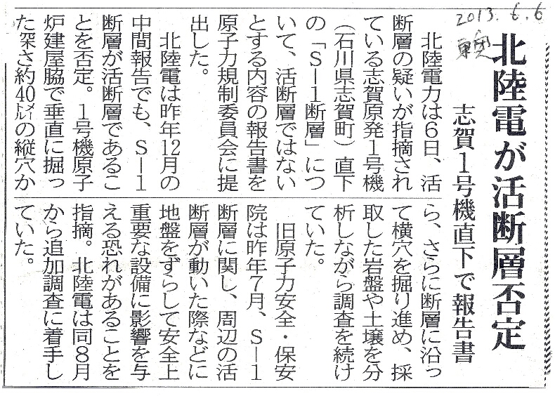 [2013_06_06_01]北陸電が活断層否定(東奥日報2013年6月6日)