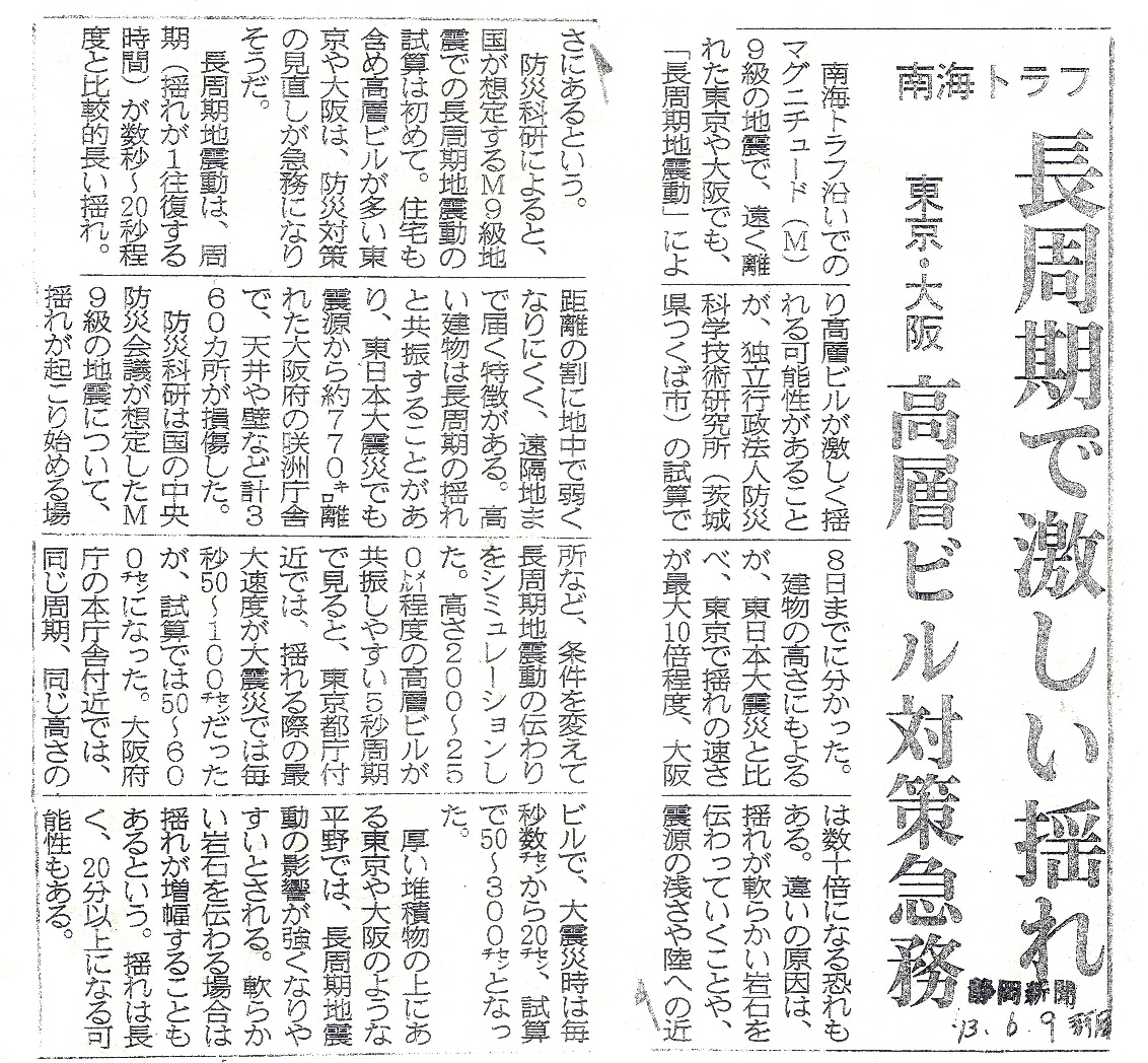 [2013_06_09_01]南海トラフ 長周期で激しい揺れ 東京・大阪 高層ビル対策急務(静岡新聞2013年6月9日)