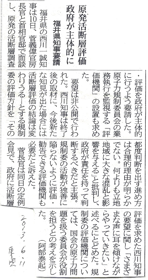 [2013_06_11_02]原発活断層評価 政府が主体的に 福井知事要請(東奥日報2013年6月11日)