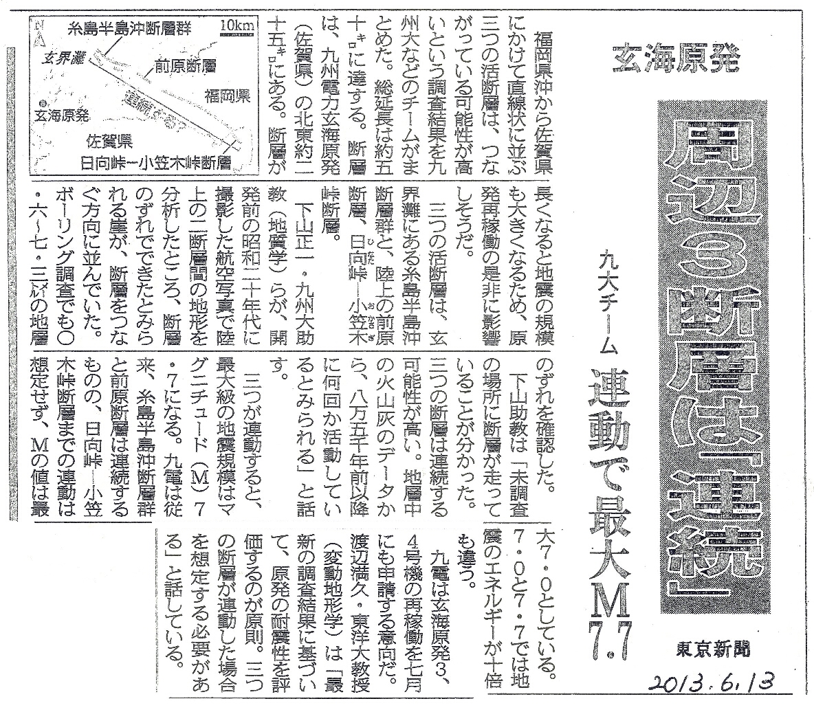 [2013_06_13_02]玄海原発 周辺3断層は「連続」 九大チーム 連動で最大M7.7(東京新聞2013年6月13日)