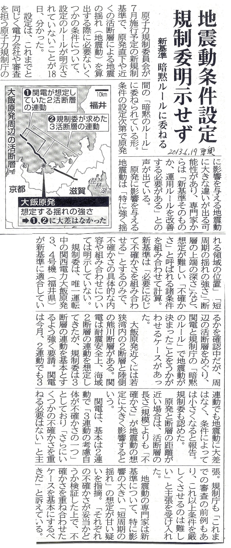 [2013_06_19_01]地震動条件設定 規制委明示せず 新基準 暗黙ルールに委ねる(東奥日報2013年6月19日)