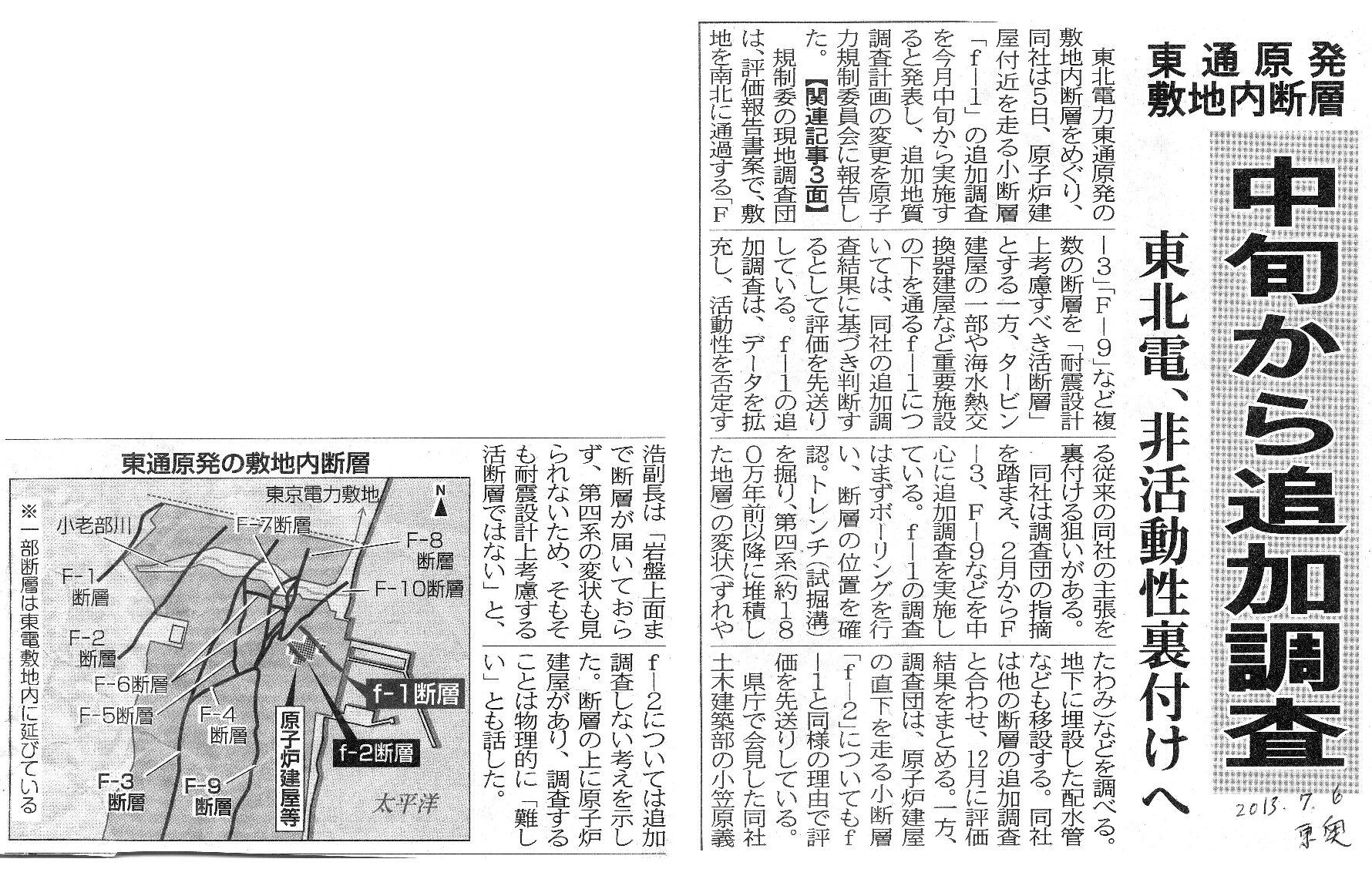 | [2013_07_06_01]東通原発敷地内断層 中旬から追加調査 東北電、日活動性裏付けへ(東奥日報2013年7月6日) |