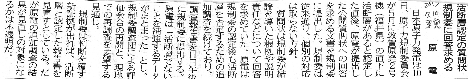 日本原子力発電は10日、原子力規制委員会が5月に敦賀原発2号機(福井県)の直下に活断層があると認定した直後、原電が提出した公開質問状への回答を求める文書を規制委に提出した。規制委は従来通り、個別の対応は取らない方針。