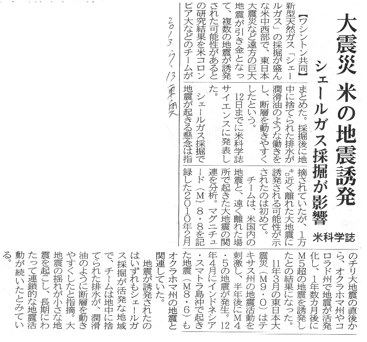 [2013_07_13_01]大震災 米の地震誘発 シェールガス採掘が影響 米科学誌(東奥日報2013年7月13日)
