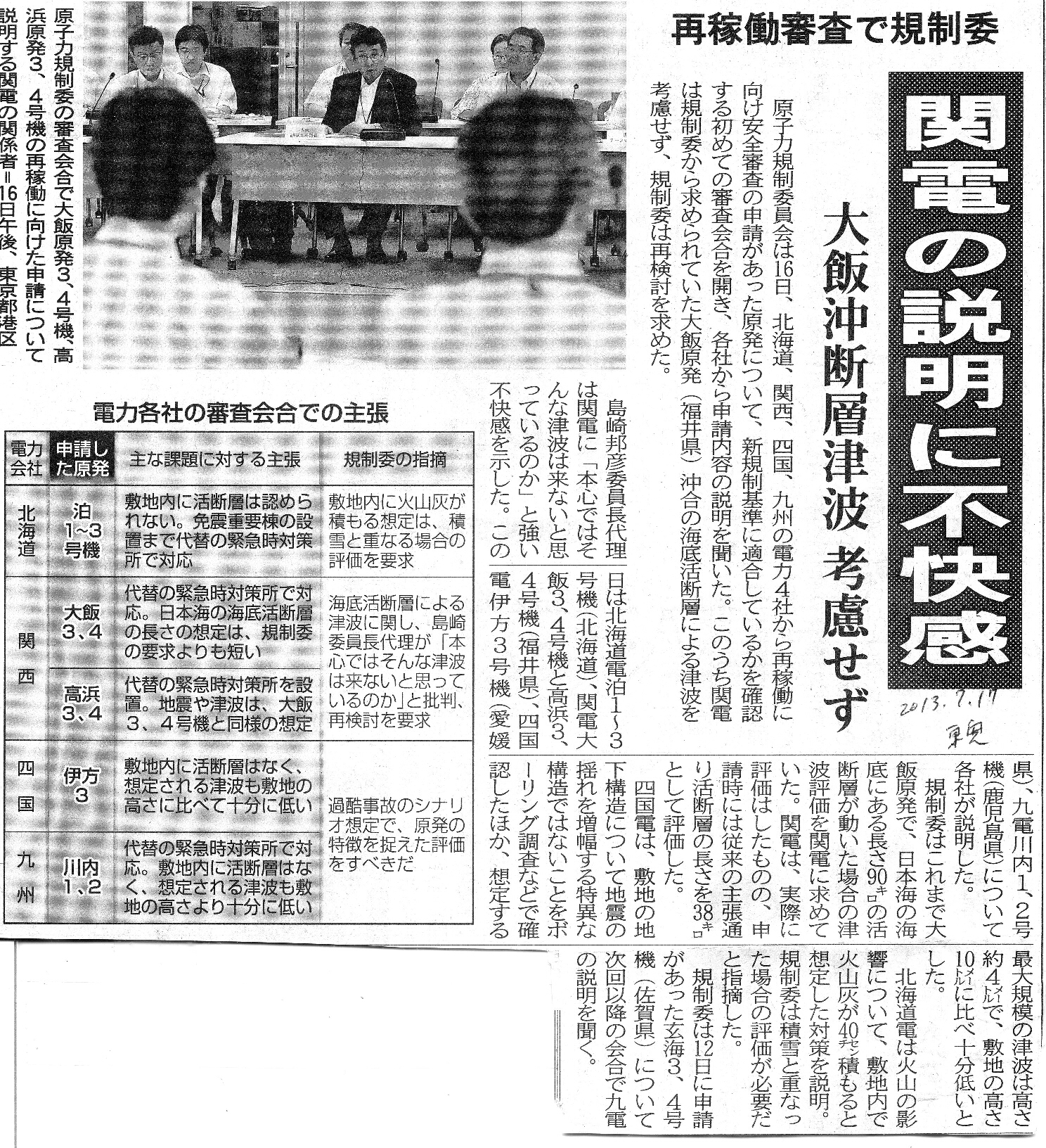 | [2013_07_17_02]再稼働審査で規制委 関電の説明に不快感 大飯沖断層津波 考慮せず(東奥日報2013年7月17日) |