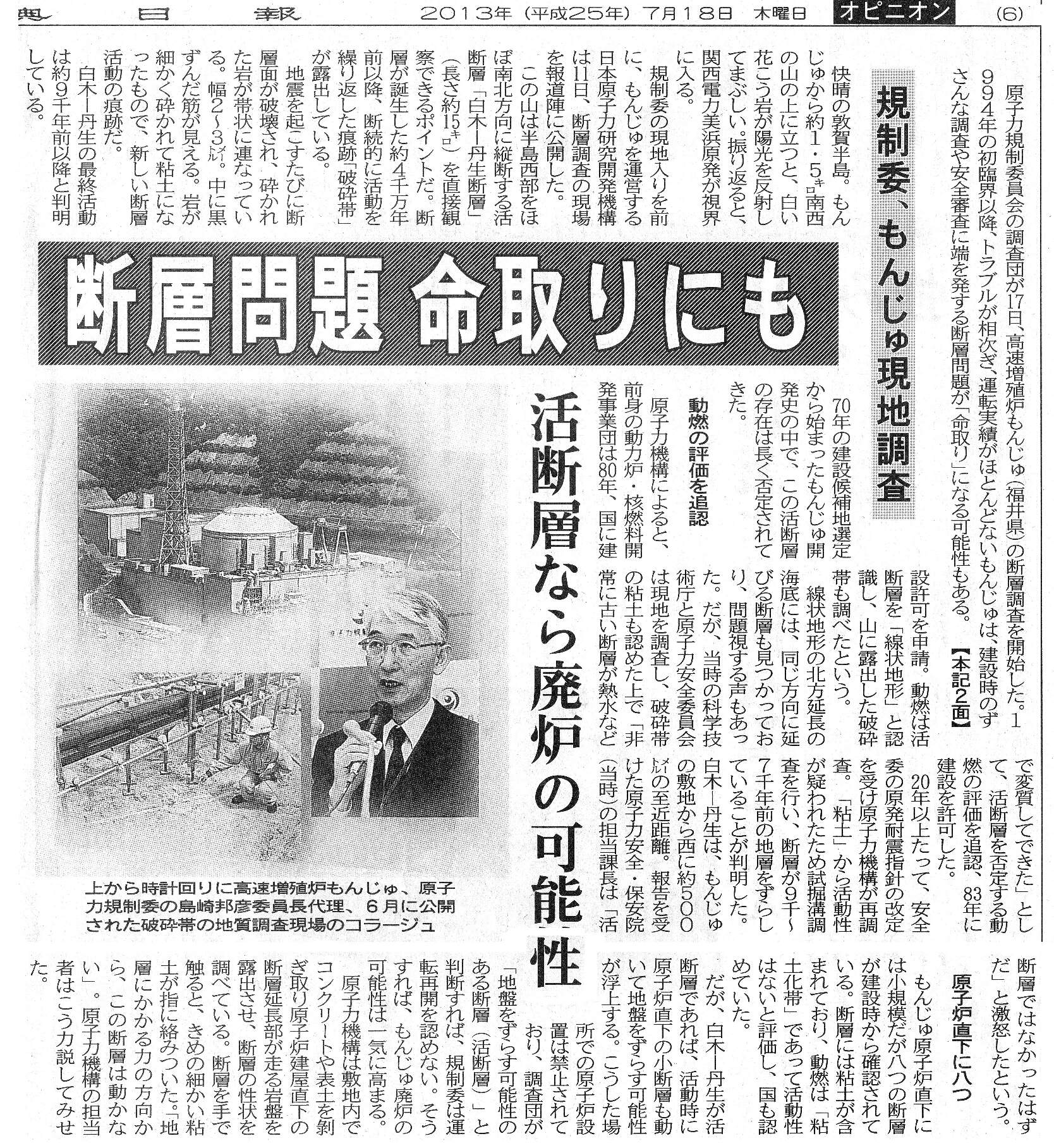 [2013_07_18_01]規制委、もんじゅ現地調査 断層問題 命取りにも 活断層なら廃炉の可能性(東奥日報2013年7月18日)
