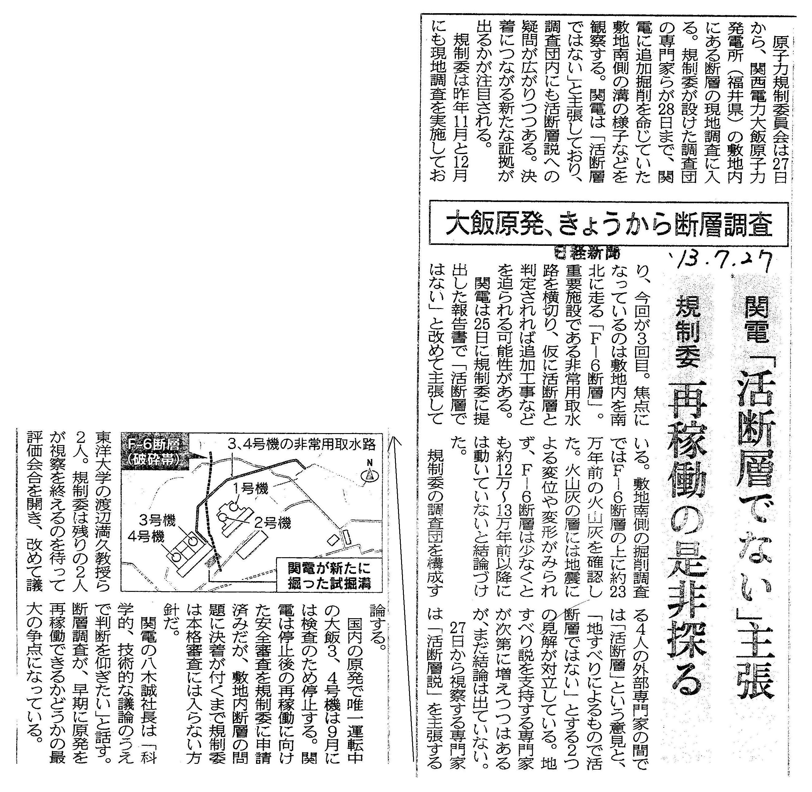| [2013_07_27_01]大飯原発、きょうから断層調査 規制委 再稼働の是非探る(日経新聞2013年7月27日) |