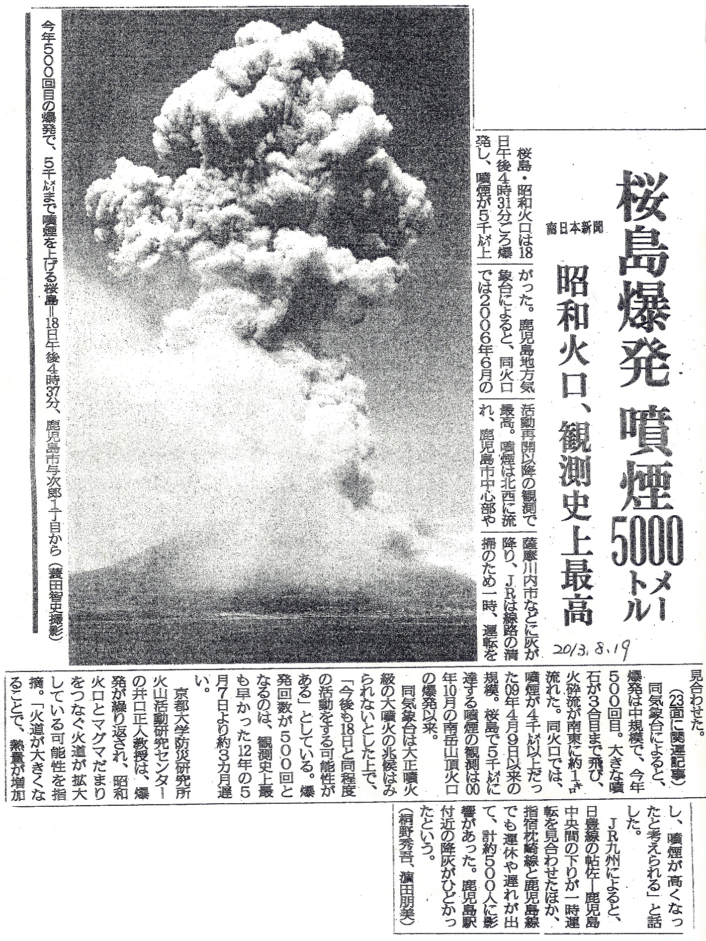 [2013_08_19_01]桜島爆発 噴煙5000メートル 昭和火口、観測史上最高(南日本新聞2013年8月19日)