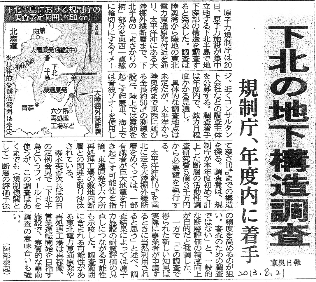 | [2013_08_21_01]下北の地下構造調査 規制庁、年度内に着手(東奥日報2013年8月21日) |