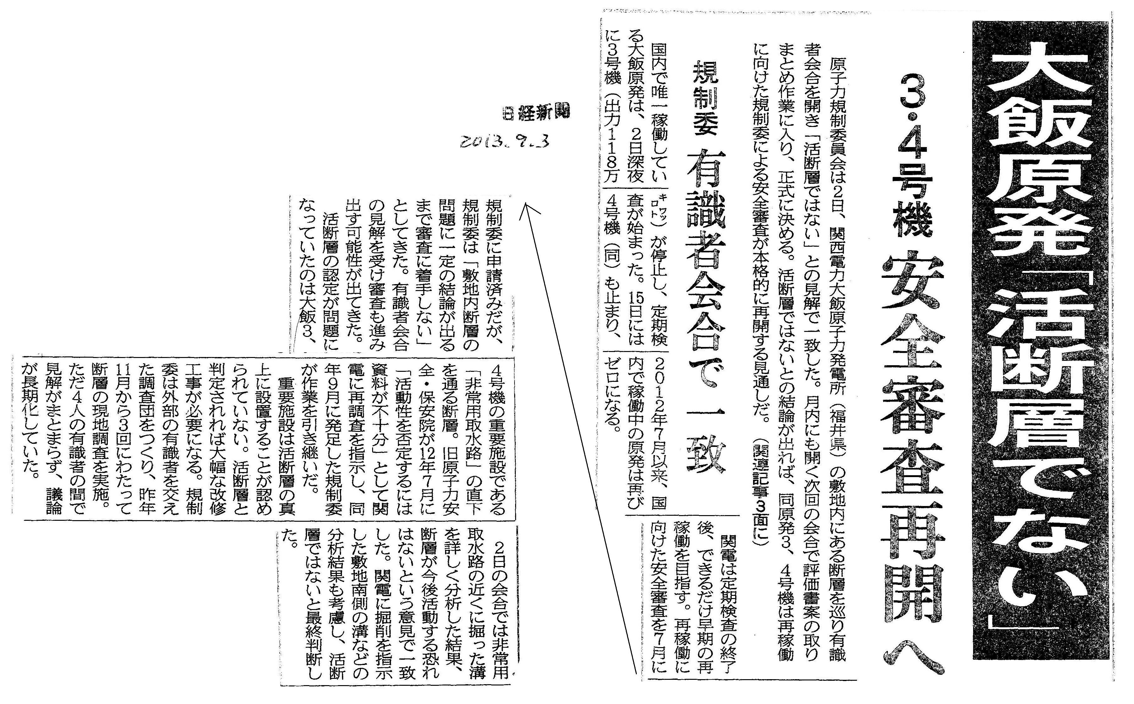 | [2013_09_03_01]規制委 大飯原発「活断層でない」 3・4号機 安全審査再開へ(日経新聞2013年9月3日) |