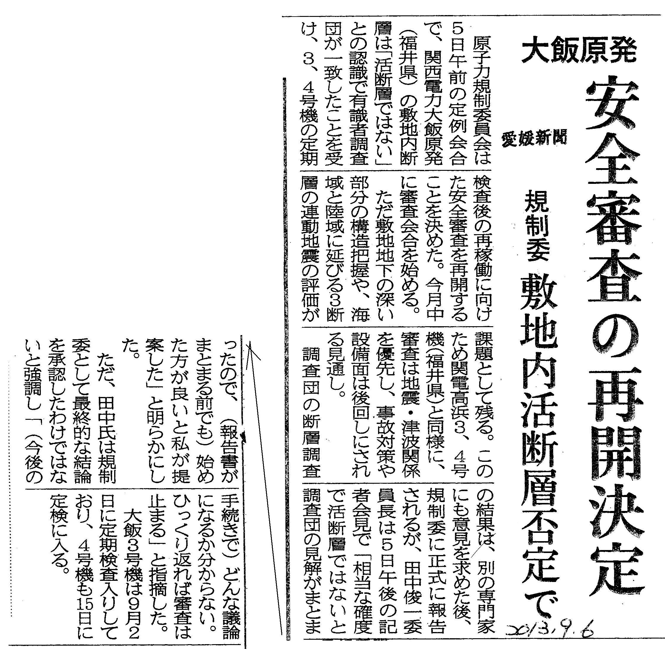 [2013_09_06_01]規制委 敷地内活断層否定で 大飯原発 安全審査の再開決定(愛媛新聞2013年9月6日)