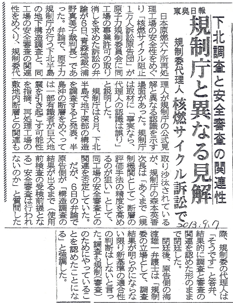 | [2013_09_07_01]下北調査と安全審査の関連性 規制庁と異なる見解 規制委代理人 核燃サイクル訴訟で(東奥日報2013年9月7日) |