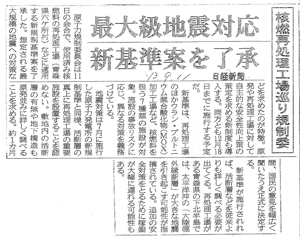 | [2013_09_11_01]核燃再処理工場巡り規制委 最大級地震対応 新基準案を了承(日経新聞2013年9月11日) |
