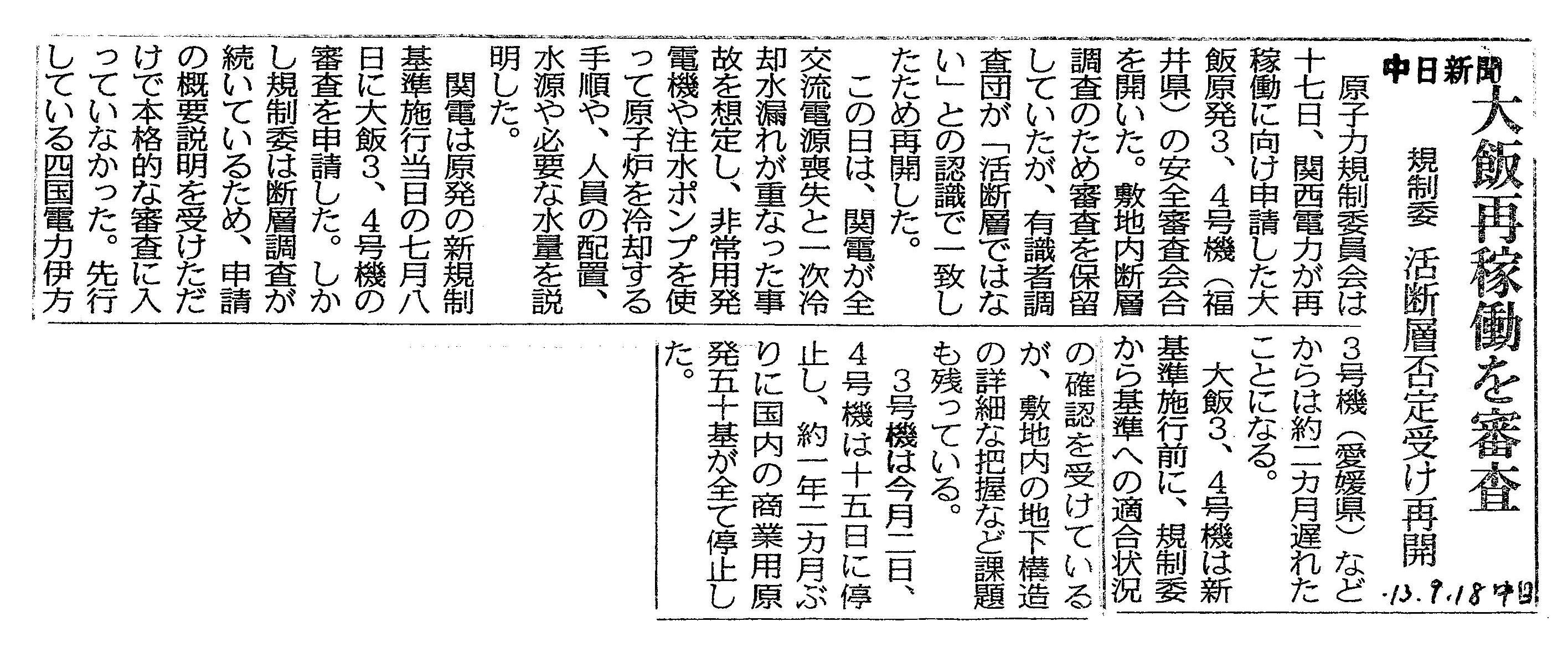 [2013_09_18_01]規制委 大飯再稼働を審査 活断層否定を受け再開(中日新聞2013年9月18日)