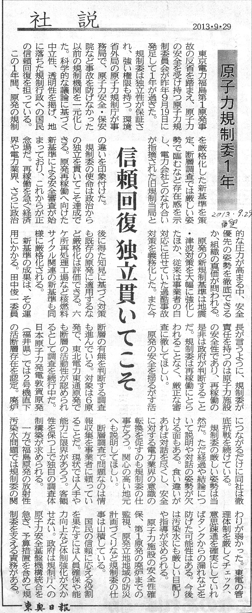 | [2013_09_29_01]社説 原子力規制委1年 信頼回復 独立貫いてこそ(東奥日報2013年9月29日) |