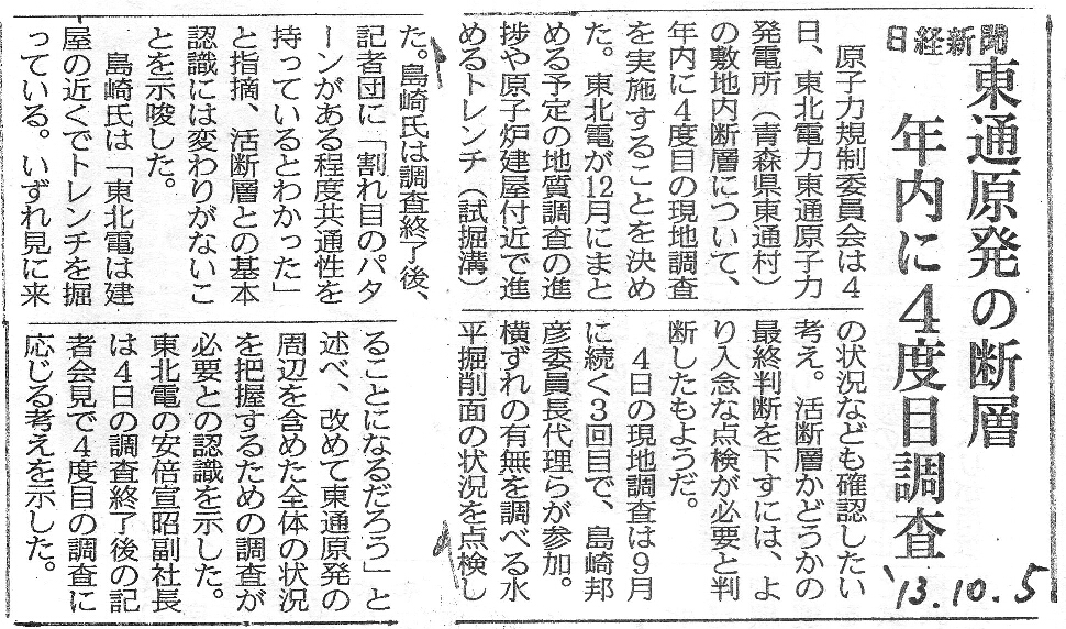 | [2013_10_05_01]東通原発の断層 年内に4度目調査(日経新聞2013年10月5日) |