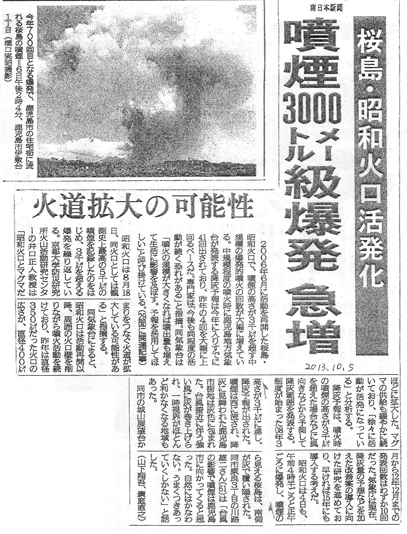[2013_10_05_02]桜島・昭和火口活発化 噴煙3000メートル級爆発 急増 火道拡大の可能性 桜島昭和火口 今年700回目爆発(南日本新聞2013年10月5日)