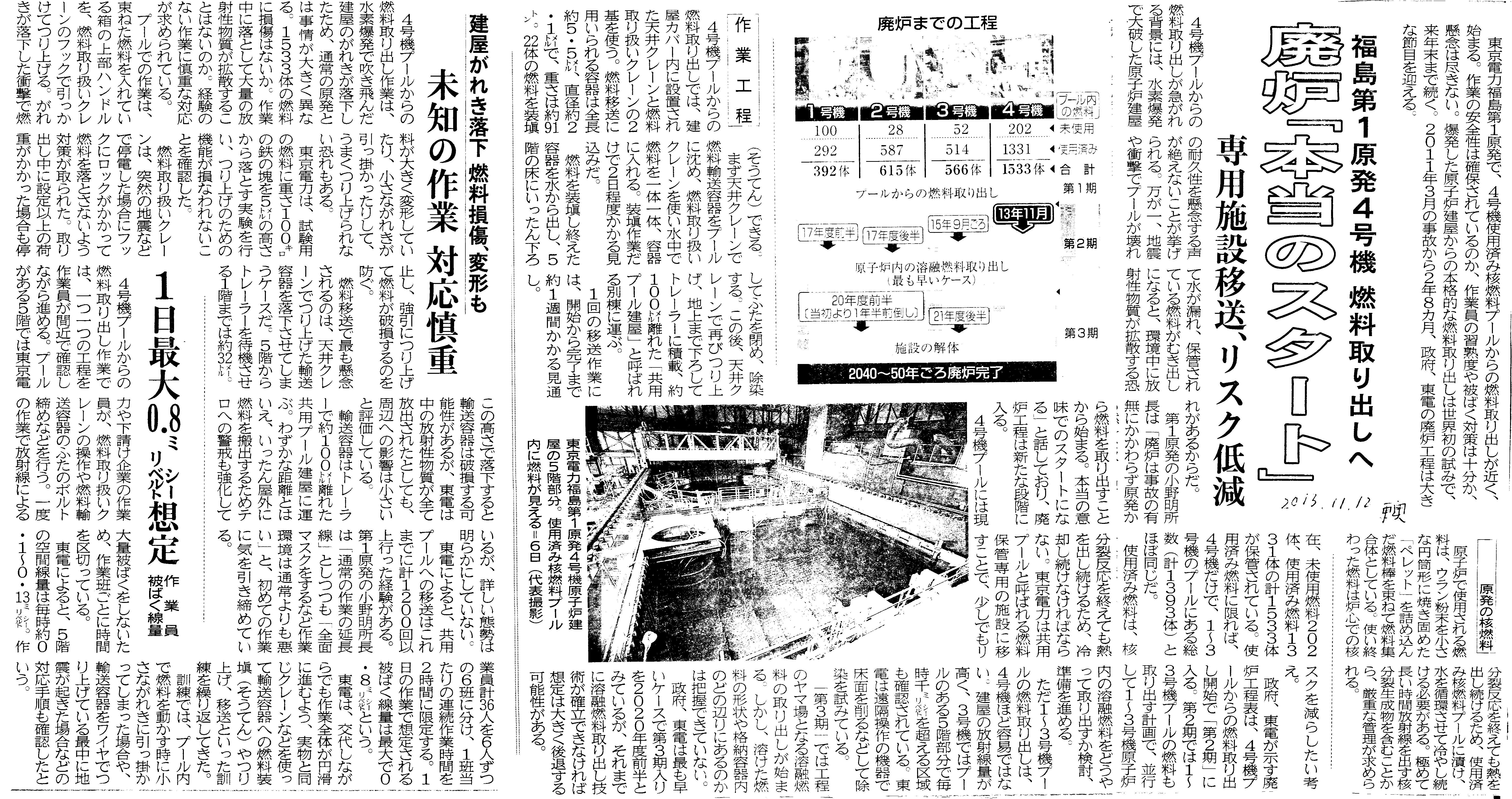 [2013_11_12_01]福島第1原発4号機 燃料取り出しへ 廃炉『本当のスタート』(東奥日報2013年11月12日)
