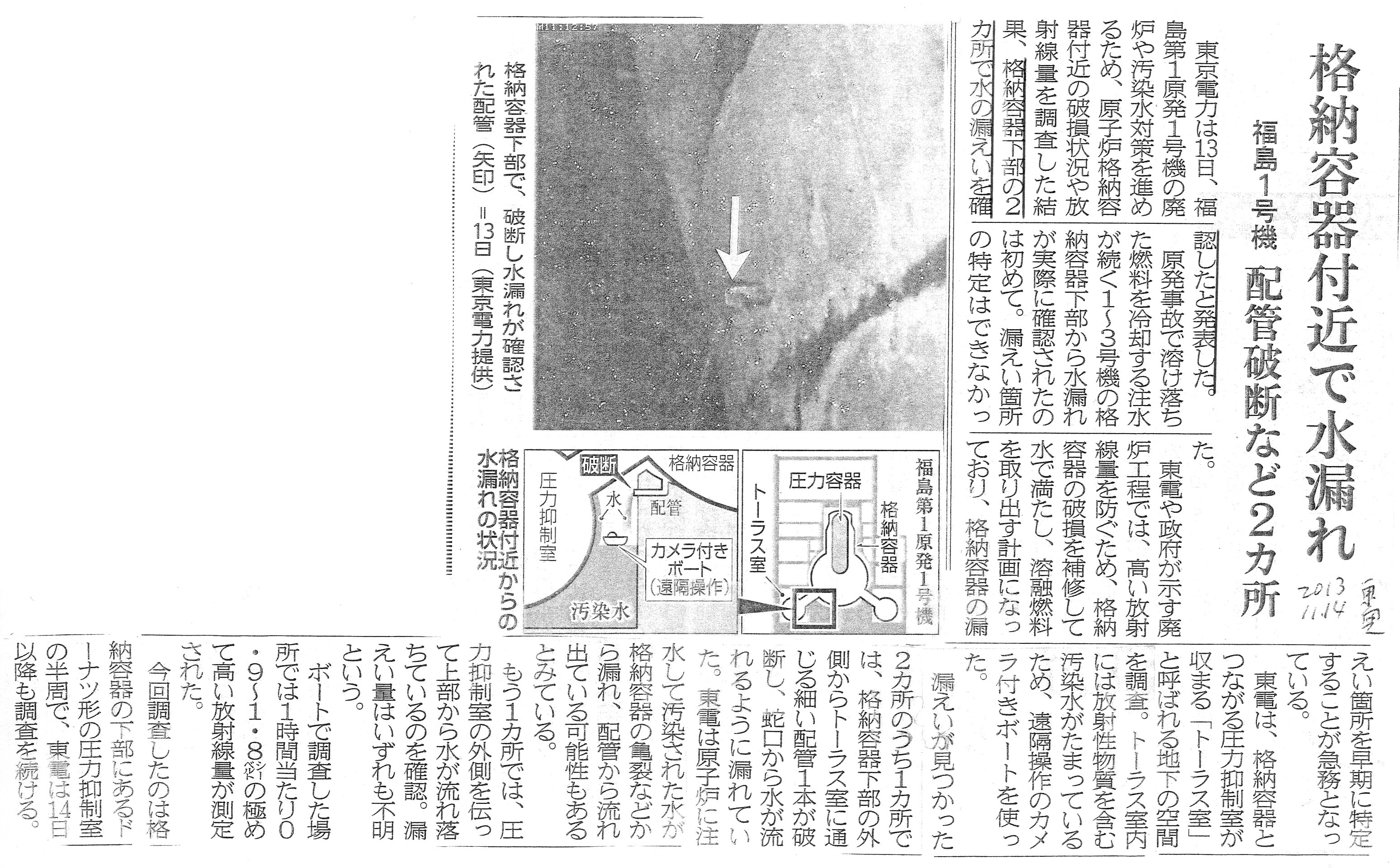 | [2013_11_14_01]福島1号機 格納容器付近で水漏れ 配管破断など2カ所(東奥日報2013年11月14日) |