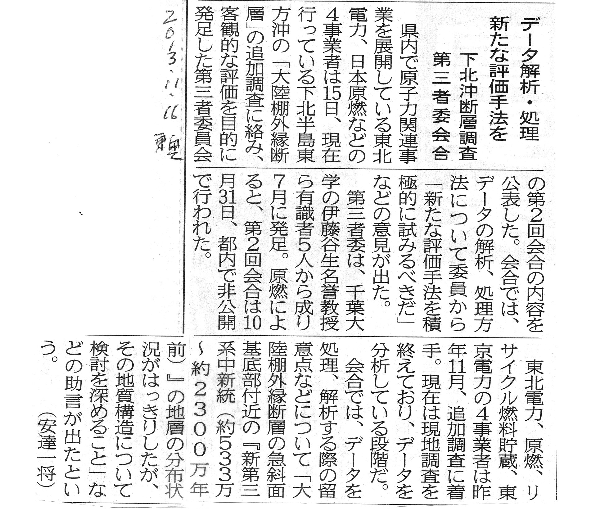 | [2013_11_16_02]下北沖断層調査第三者会合 新たな評価手法を(東奥日報2013年11月16日) |