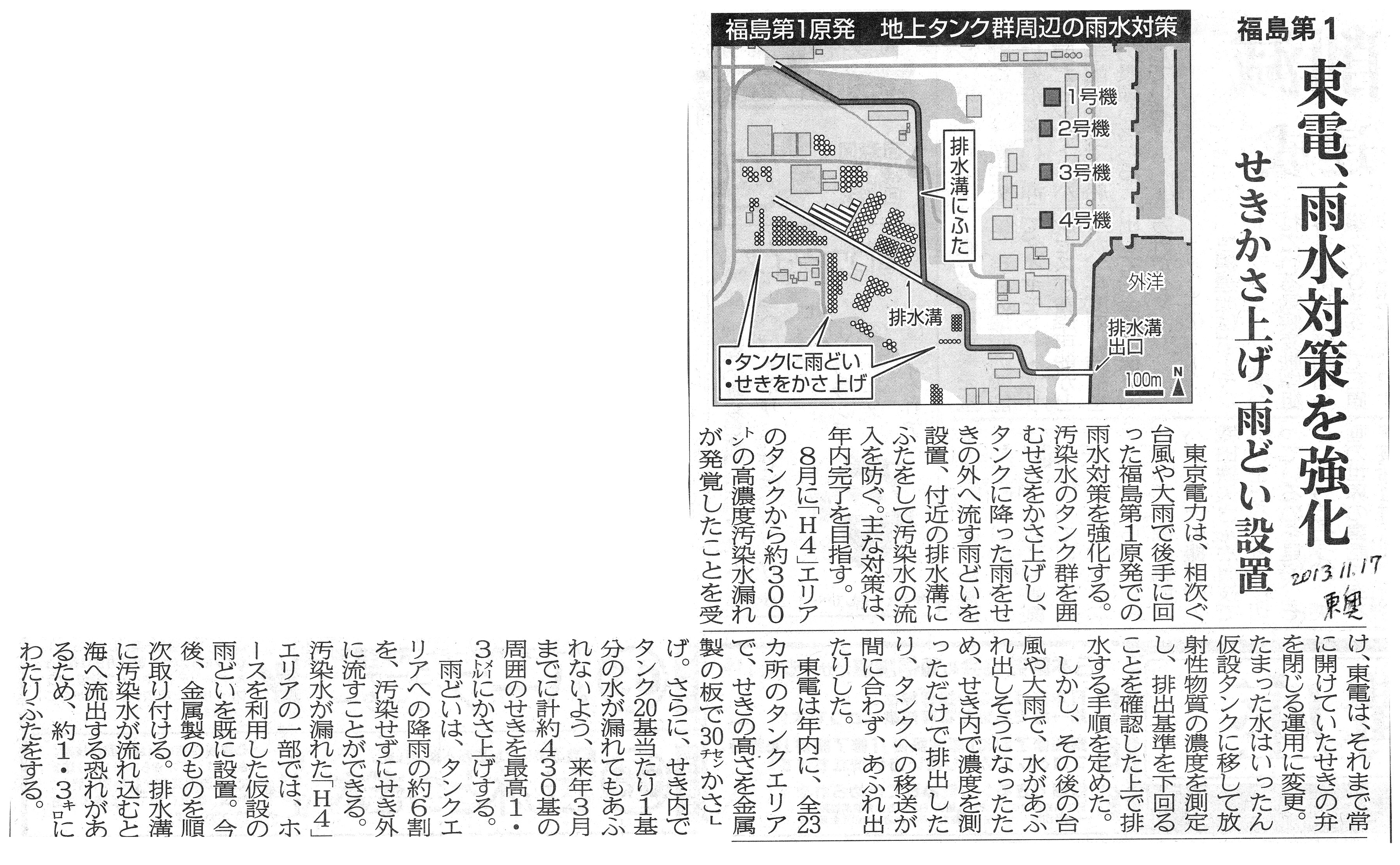 | [2013_11_17_01]福島第一 東電、雨水対策を強化 せきかさ上げ、雨どい設置(東奥日報2013年11月17日) |