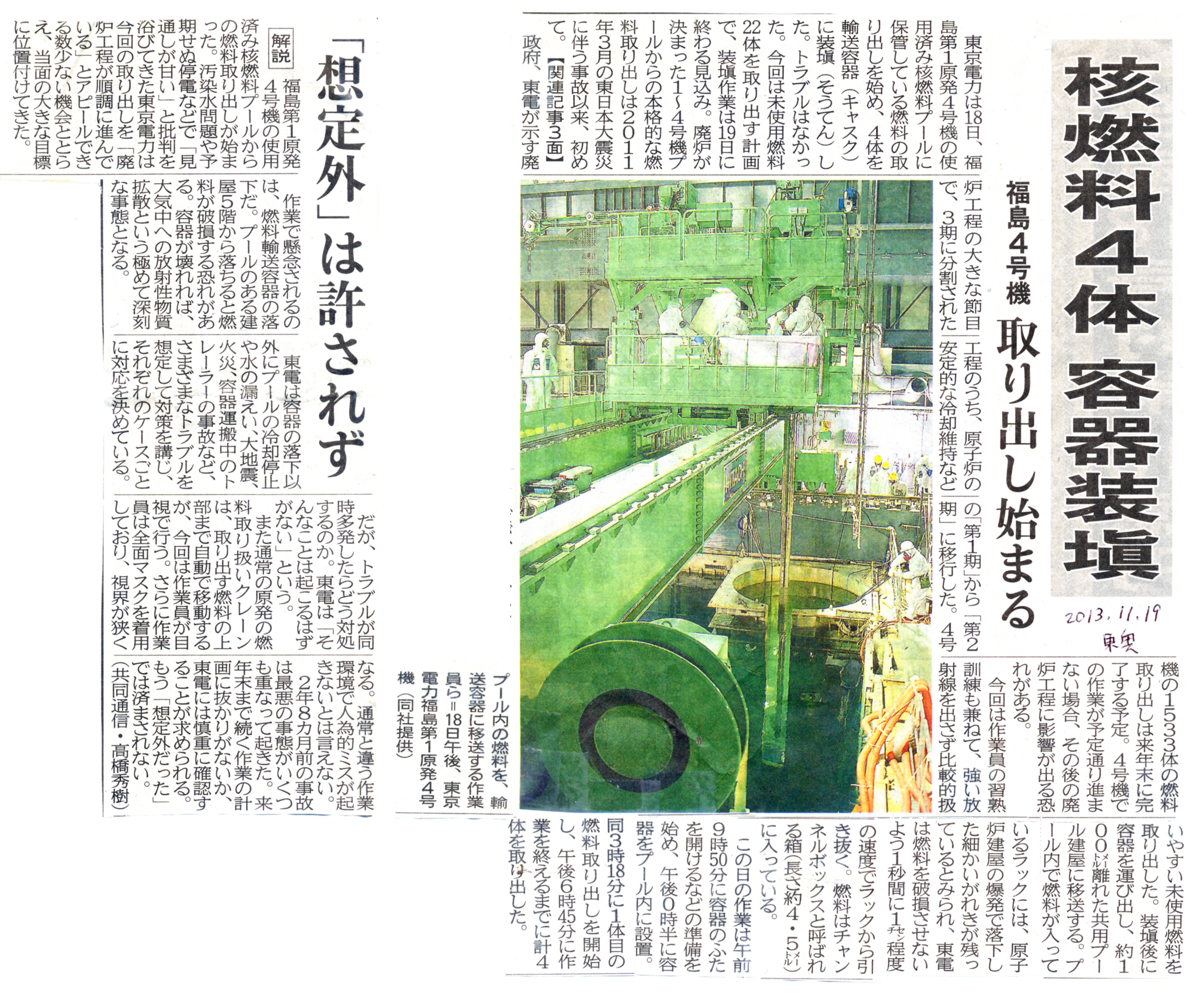 [2013_11_19_01]核燃料4体 容器装填 取り出し始まる 「想定外」は許されず(東奥日報2013年11月19日)