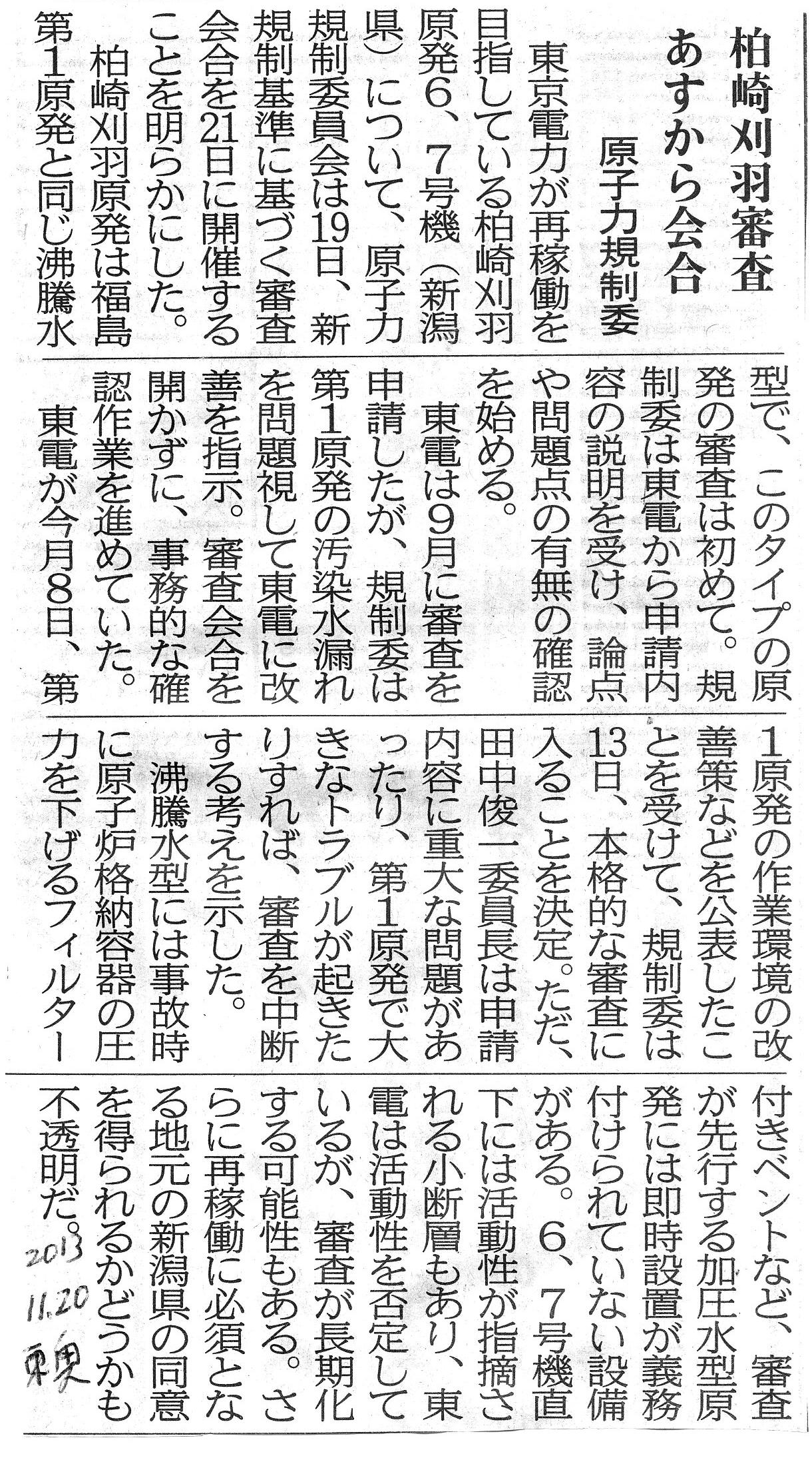 [2013_11_20_01]原子力規制委 柏崎刈羽審査 あすから会合(東奥日報2013年11月20日)